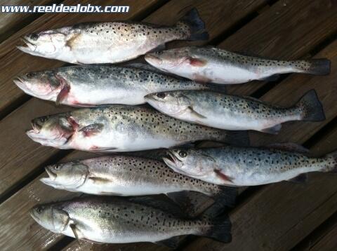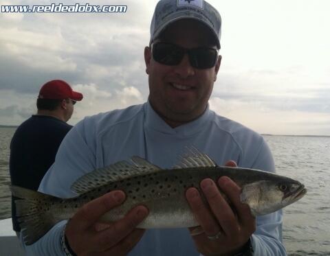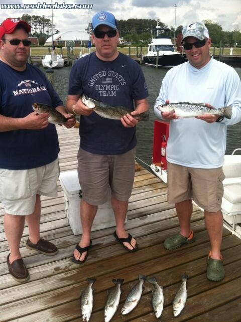 I had Bill Tucker of Kitty Hawk and a couple of his buddies from the Northern Neck of Va. out this morning. The SW wind increased steadily as the day progressed and there were squalls around us most of the time. We were lucky though; we never got rained on and managed to catch a nice mess of speckled trout and a puppy drum. The trout bit fairly well at times and were a beautiful 16"-20" class. After we kept enough for them to eat we turned loose more keeper sized fish at several different spots. These guys were laid back and I enjoyed having them on the boat.