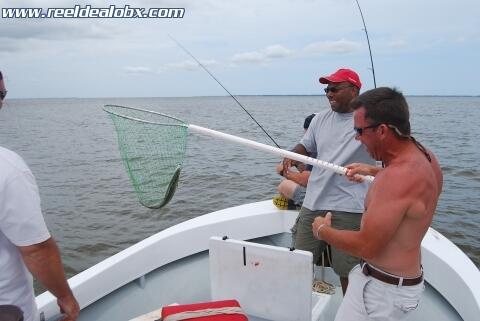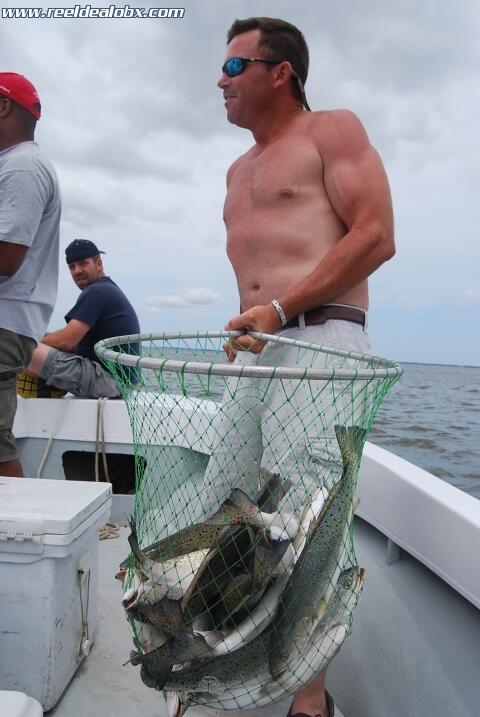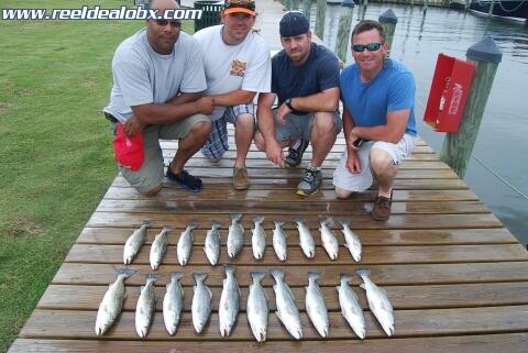 Had a group of guys from my hometown today that were in town to celebrate an upcoming wedding. Mike, Tom, Derek and Chuckie joined me for an 8 hour excursion that began sunny and slick calm and ended up overcast and breezy. Such is the OBX...We covered a lot of ground, fished hard and changed things up a lot. We scrapped it out until we came up with our limit of nice keepers. We caught upwards of 60 speckled trout today and some other species as well.These guys were onto it with the rod and I had a blast just fishing with them and watching them have a good time. It always seems like the groups that are going to enjoy themselves regardless, often experience some of the best action...Today was by far the best numbers of fish we have seen this season and these guys had a day full of it. Thanks a bunch for fishing with me and I look forward to bumping into y'all when I'm back home. I hope you guys had a good time! Tom, best wishes on the wedding Saturday, I'm sure the Ware River Yacht Club will be rockin'. Y'all behave and thanks again...